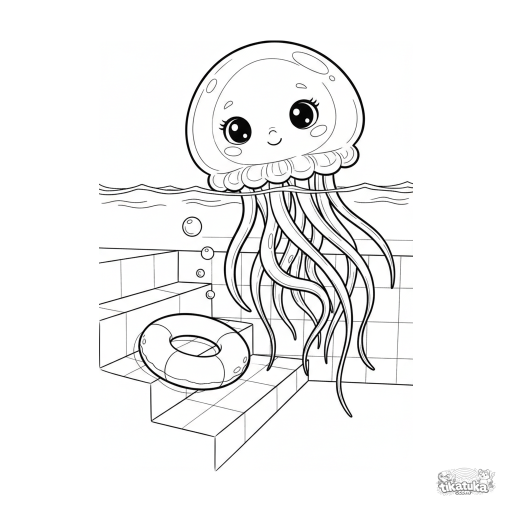 Ausmalbild für Kinder 7-9: Eine sanfte Qualle mit langen Tentakeln treibt langsam an der Pooltreppe vorbei, ein Schwimmring liegt in der Nähe. Fließende Linien.