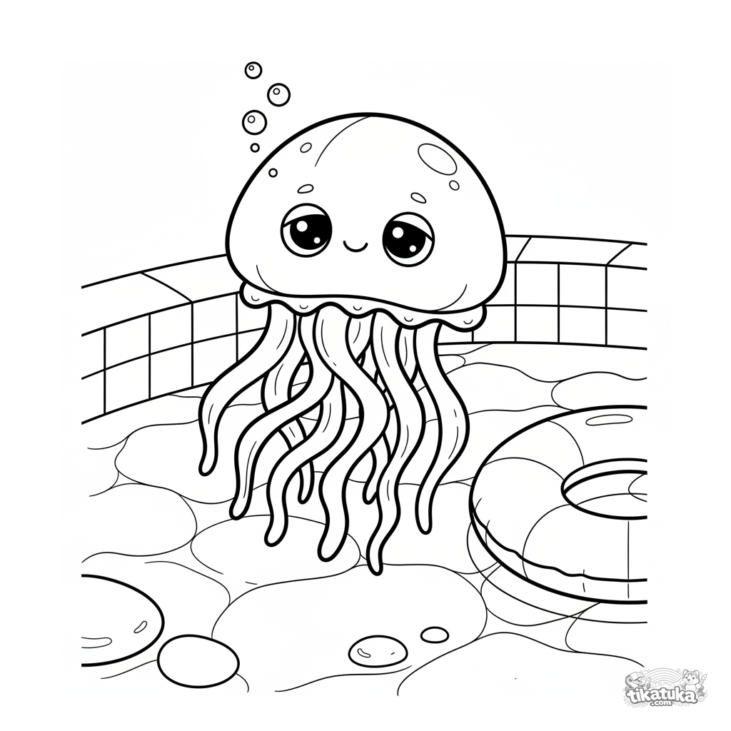 Ausmalbild für Kinder 7-9: Eine sanfte Qualle treibt über dem Poolboden, mit dem Schatten eines Schwimmrings in der Nähe. Fließende Linien, friedliche Szene.
