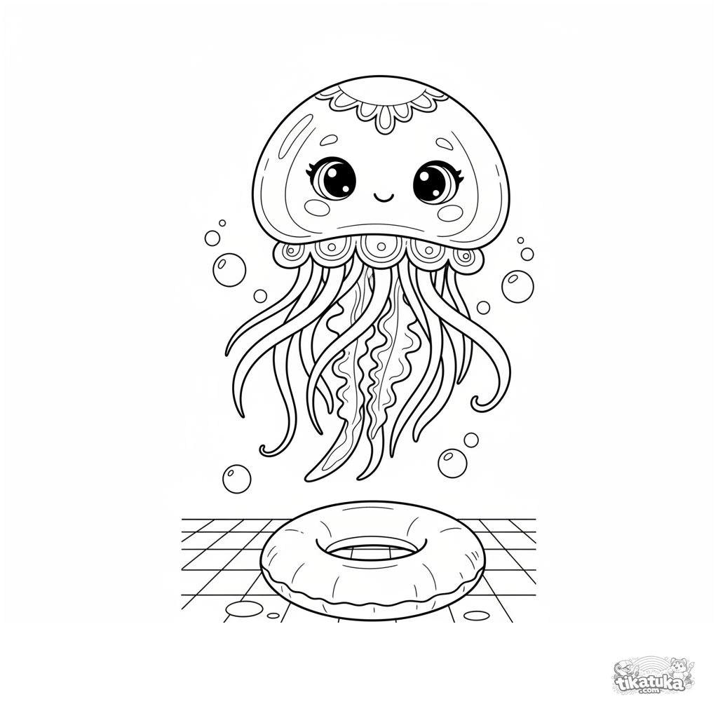 Detailliertes Ausmalbild für ältere Kinder von 10-12 Jahren: Eine anmutige Qualle schwebt über dem Poolboden an einem leeren Schwimmring vorbei. Detaillierte Tentakel, lockerer Aquarell-Skizzen-Stil, gelassene Atmosphäre.