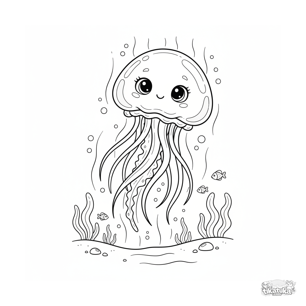 Ausmalbild einer anmutigen Qualle, die in einem Sonnenstrahl im Flachwasser treibt. Für 7-9 Jahre.
