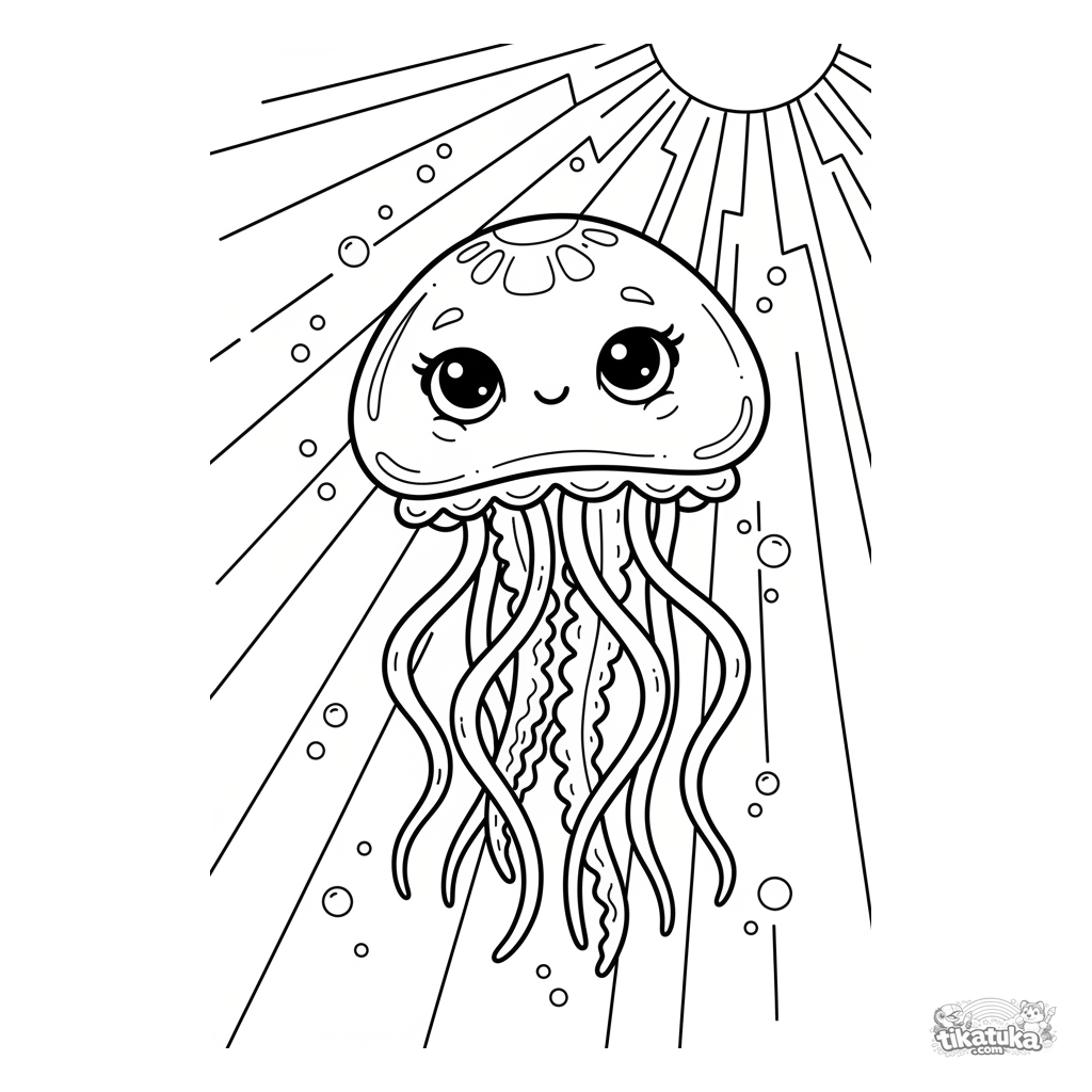 Ausmalbild für Kinder 4-6: Eine anmutige Qualle pulsiert sanft aufwärts durch einen Sonnenstrahl im Flachwasser. Langer, luftiger Skizzenstil.