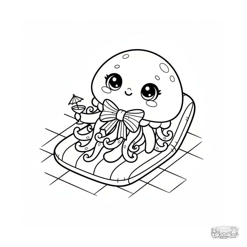 Ausmalbild für Kinder 4-6: eine süße Qualle mit einer Schleife entspannt auf einem aufblasbaren Stuhl am Boden eines Pools. Lustige Szene, einfache Details.