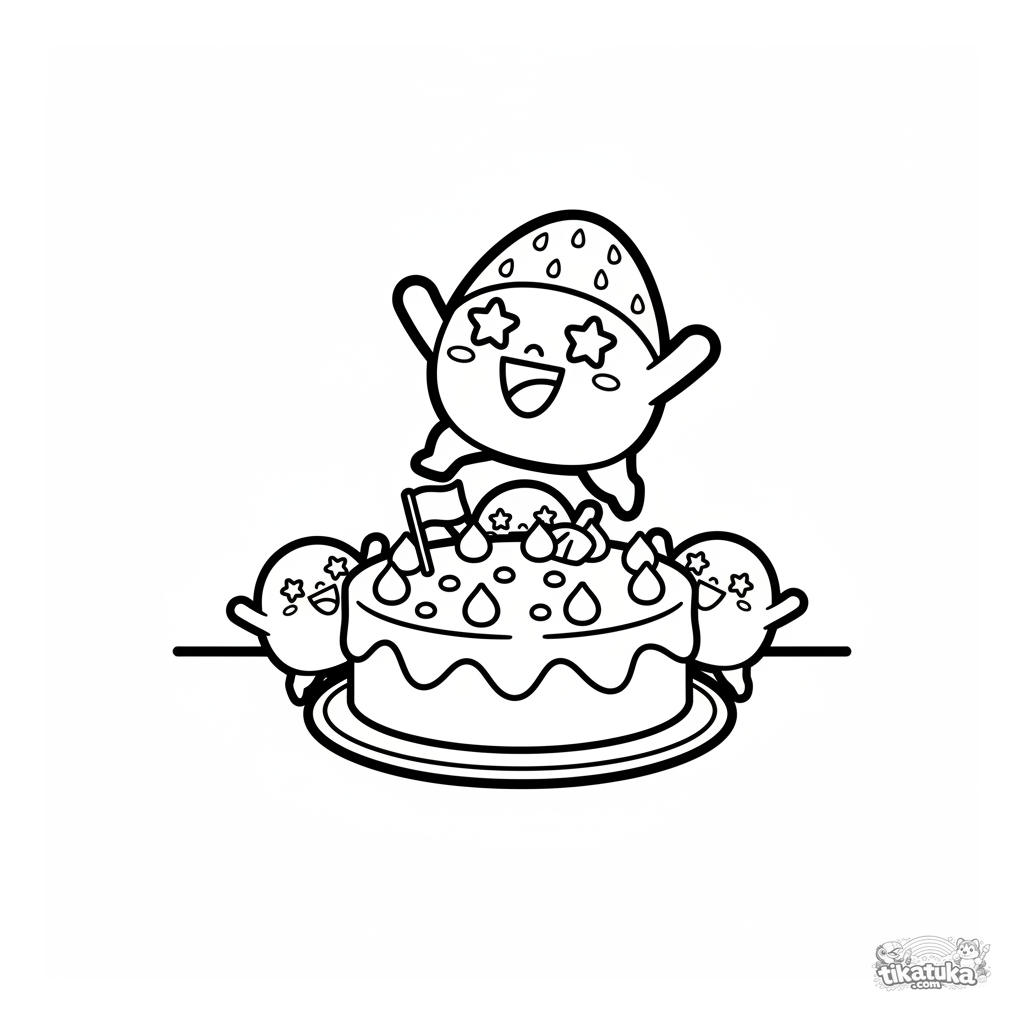 Sehr einfaches Ausmalbild für Kleinkinder 2-3: Ein fröhlicher Mochi hüpft auf einem Kuchen. Große, klare Formen, minimale Details.