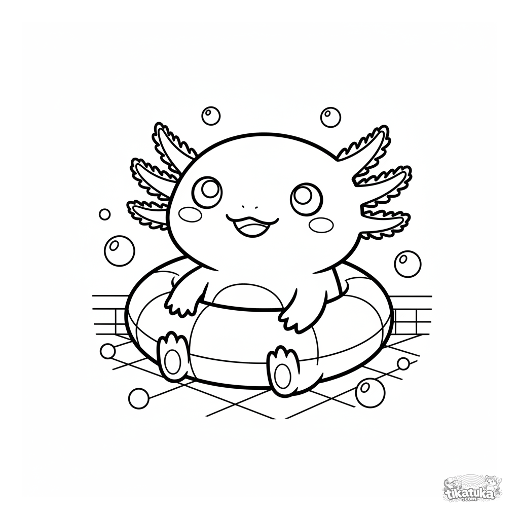 Ausmalbild eines süßen Axolotls am Boden eines Pools mit einem Schwimmring. Für Kinder von 4-6 Jahren.