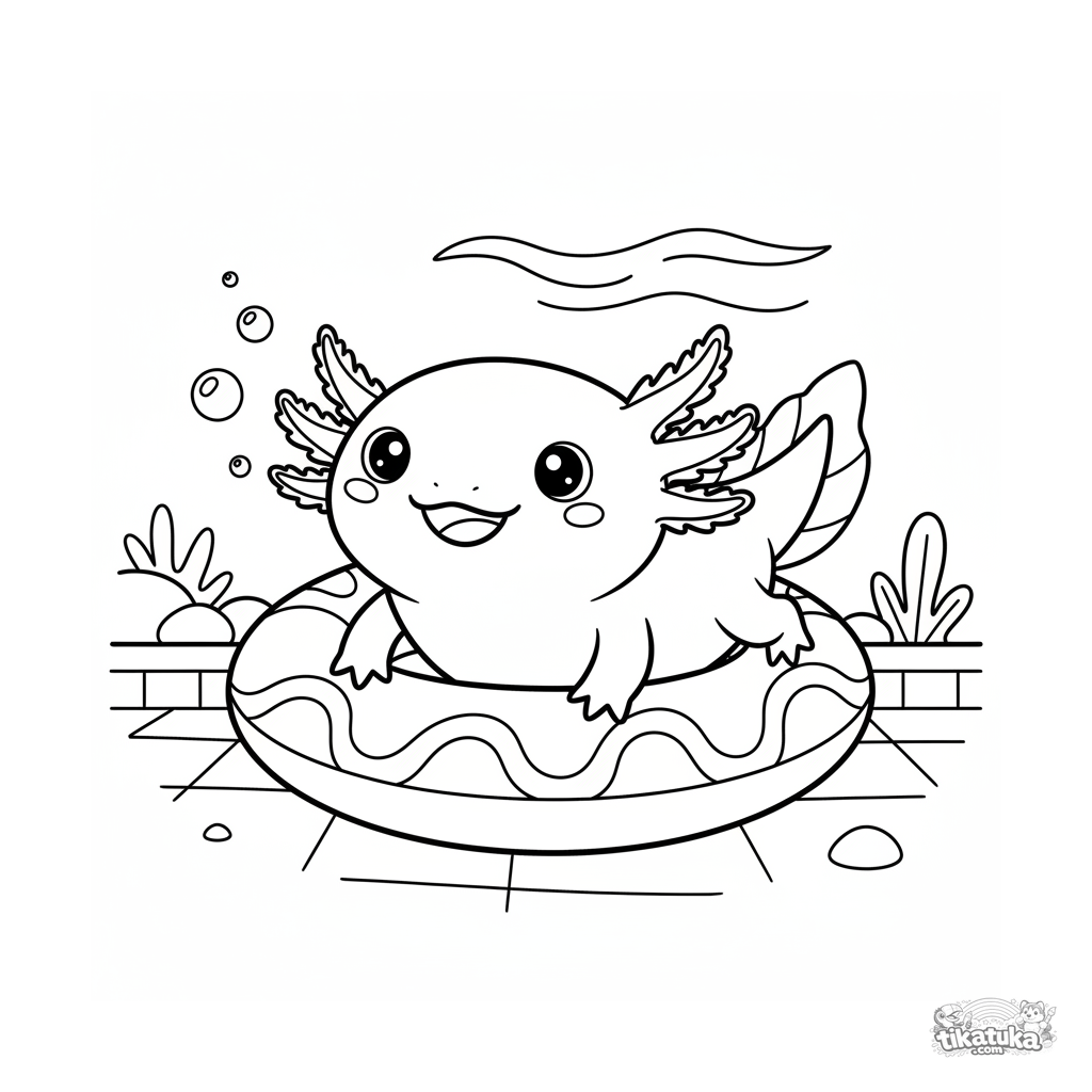 Ausmalbild für Kinder 4-6: ein süßer Axolotl schwimmt unter einem Schwimmring am Boden eines Pools. Einfache Linien, lustige Szene.