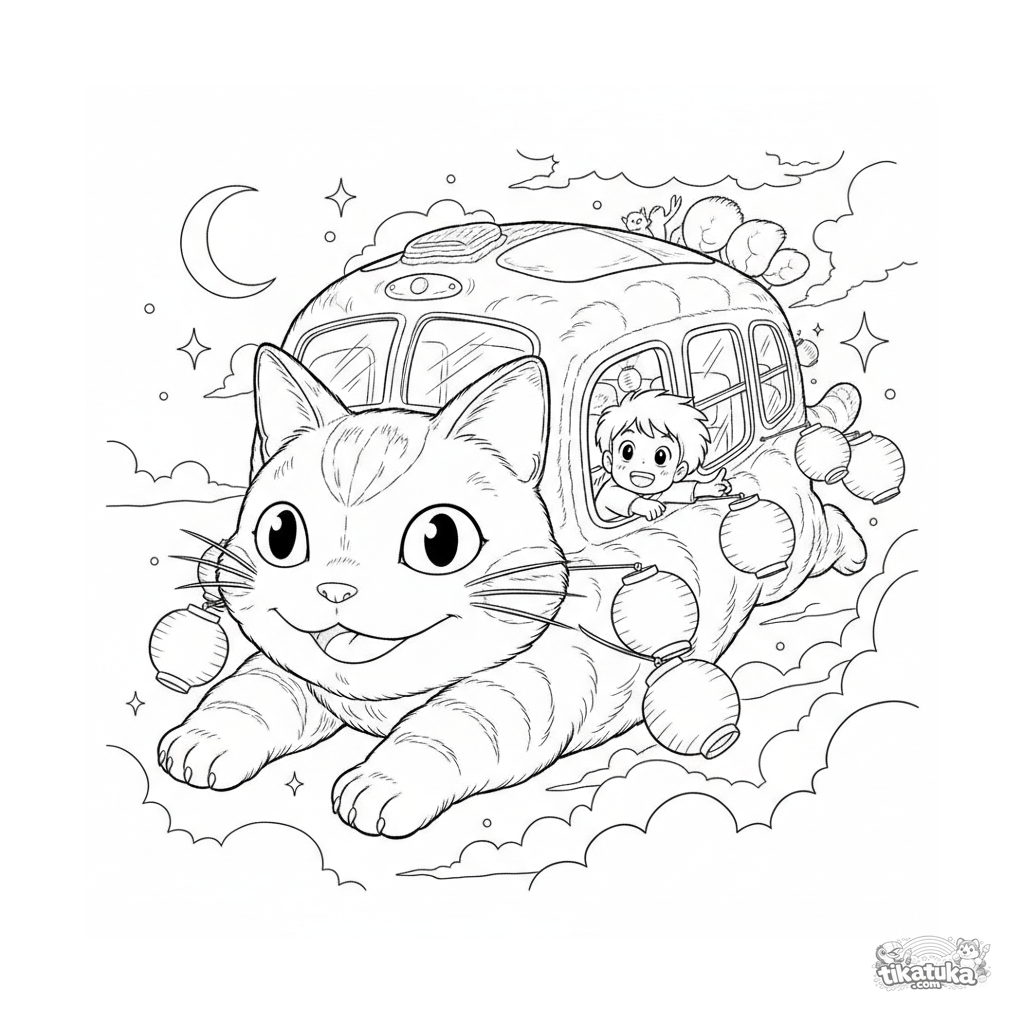 Magisches Anime-Ausmalbild: Ein Katzenbus-Geist galoppiert mit einem Kind im Fenster durch den Nachthimmel. Detaillierte Wolken, Sterne und Fellmuster. Für Kinder von 10-12 Jahren.