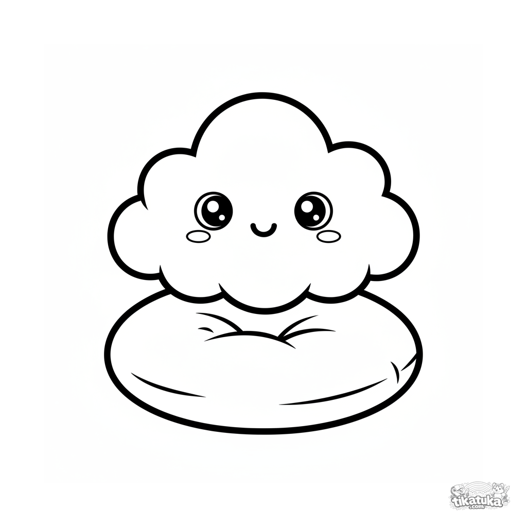 Kawaii-Ausmalbild für Kleinkinder: eine lächelnde, flauschige Wolke schwebt über einem weichen Kissen. Sehr einfache und süße Formen.