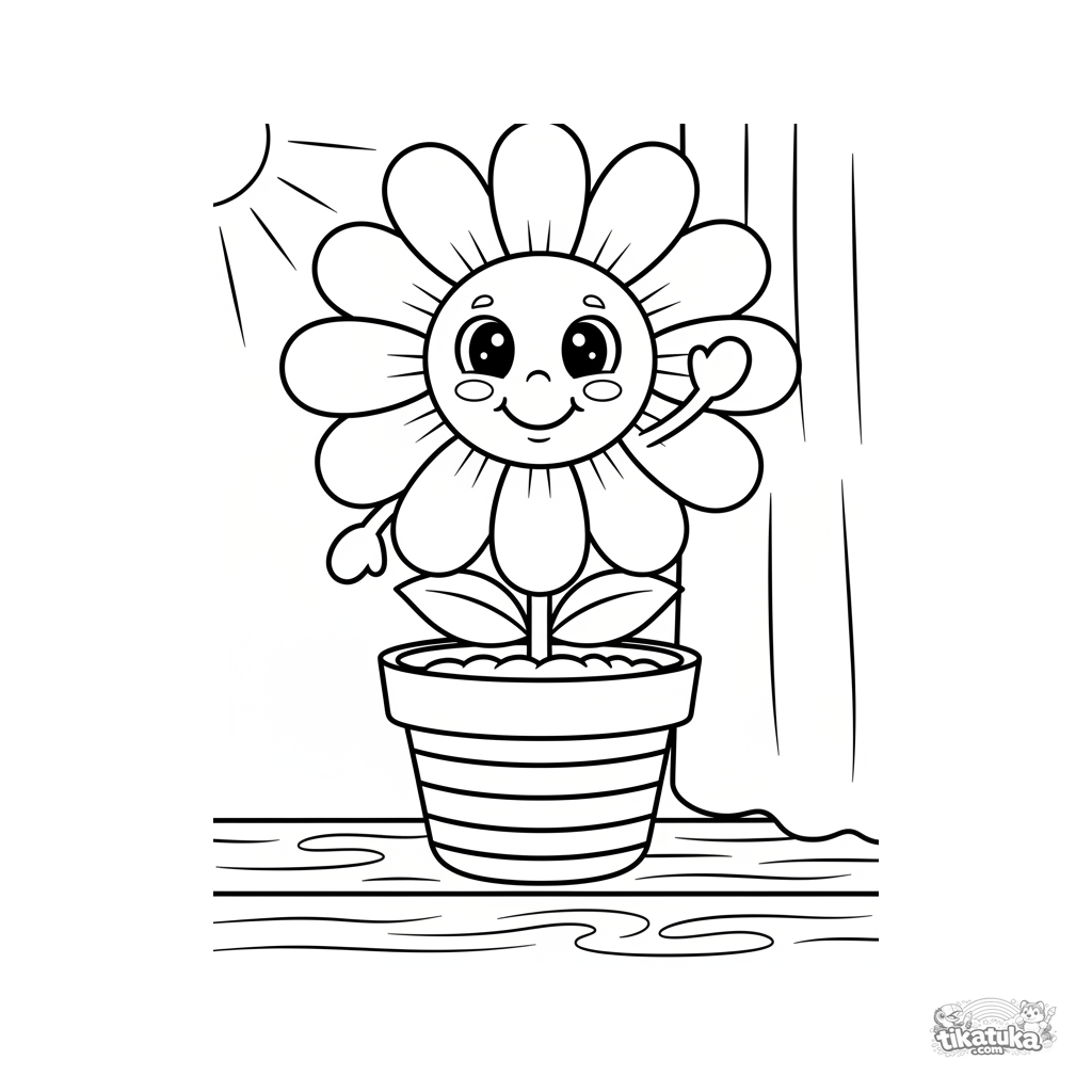 Einfaches Ausmalbild für Kleinkinder 2-3: Ein lächelndes Gänseblümchen im Topf auf dem Fensterbrett. Große Formen, dicke Umrisse, wenige Details.