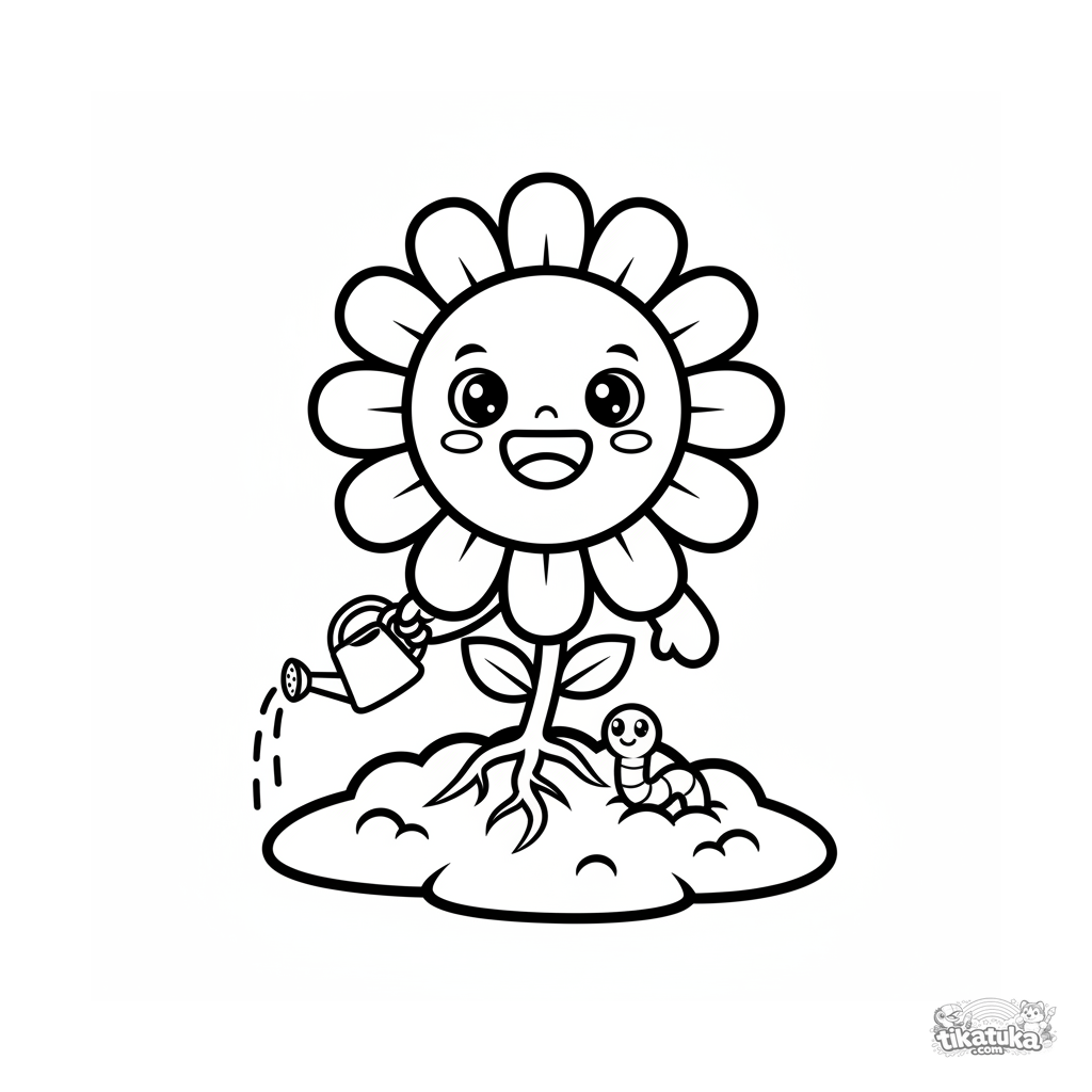 Einfaches Ausmalbild für Kleinkinder 2-3: Ein lächelndes Gänseblümchen mit Blattarmen gießt sich selbst aus einer Gießkanne. Große klare Formen, wenige Details.