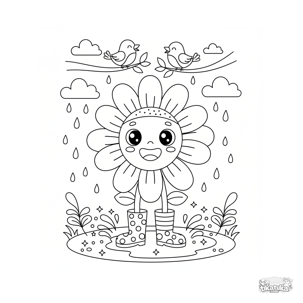 Ausmalbild für 4-6 Jahre: Ein lächelndes Kawaii-Gänseblümchen in übergroßen Gummistiefeln steht in einer Pfütze nach einem Frühlingsschauer.
