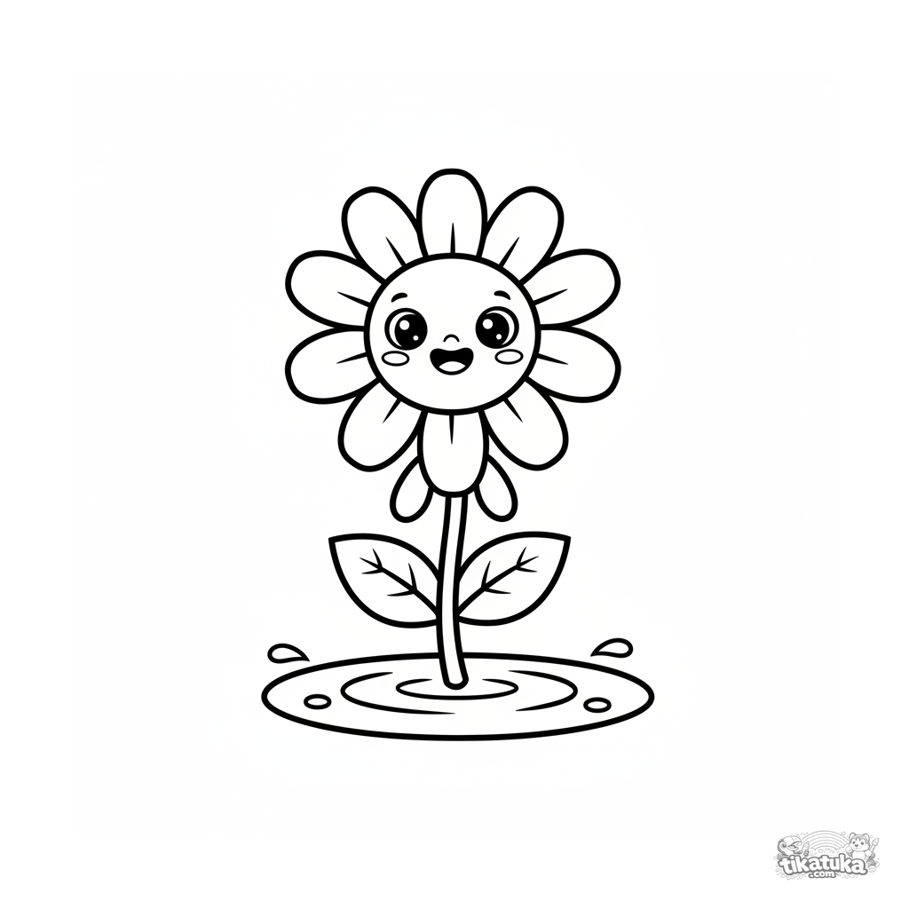 Ausmalbild für Kleinkinder: ein lächelndes Kawaii-Gänseblümchen in einer Regenpfütze. Einfache, große Formen mit breiten Rändern.