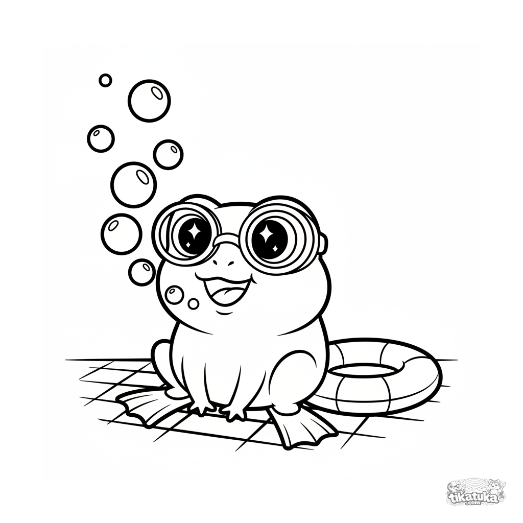 Ausmalbild für Kleinkinder 2-3: Ein niedlicher Frosch mit Schwimmbrille sitzt am Boden eines Pools neben einem Schwimmring. Große, einfache Formen.