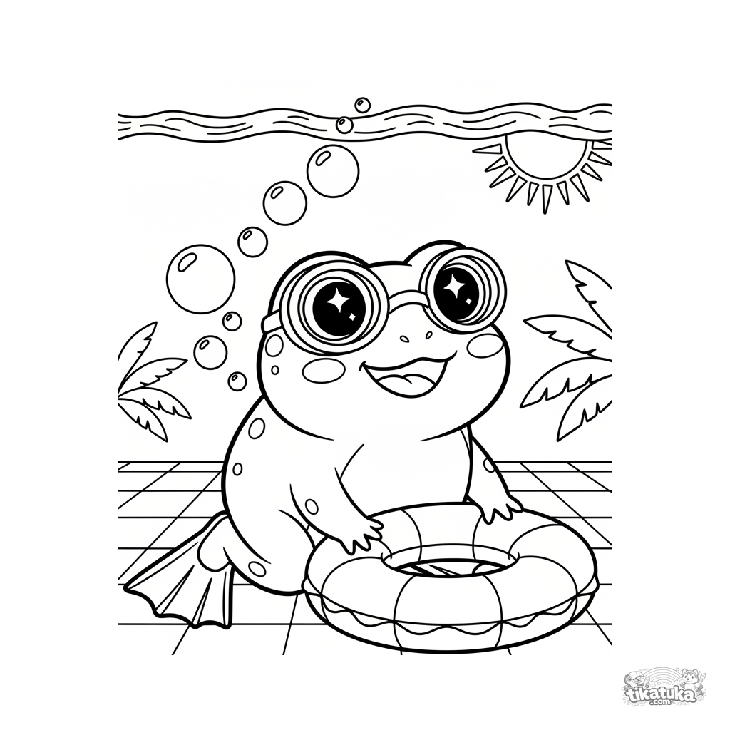 Ausmalbild eines süßen Kawaii-Frosches mit Schwimmbrille, der den Poolgrund erkundet. Für Kinder von 7 bis 9 Jahren.