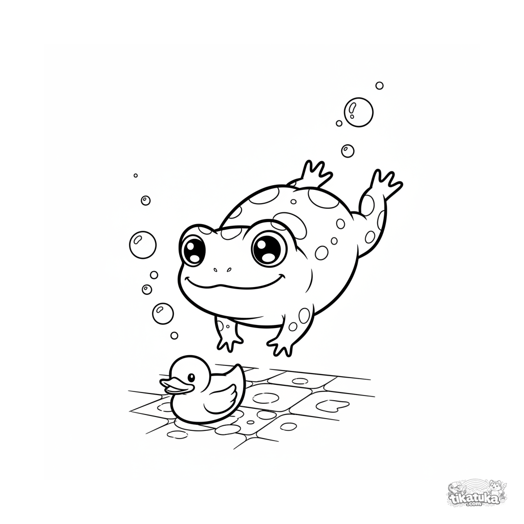 Ausmalbild für Kinder von 4-6 Jahren: Ein süßer Kawaii-Frosch taucht zum Poolboden nach einem Quietscheentchen. Dynamische Pose, Blasen, klare Formen zum Ausmalen.