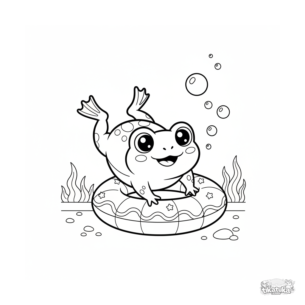 Ausmalbild für Kinder 7-9: Ein süßer Chibi-Frosch taucht zum Boden eines Pools in Richtung eines Schwimmrings. Dynamische Pose, Blasenspur.