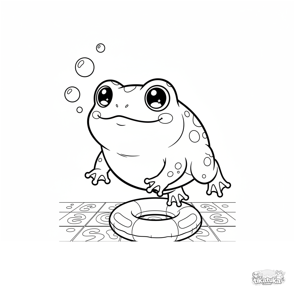 Ausmalbild für Kinder 4-6: Ein süßer Anime-Frosch taucht an einem aufblasbaren Ring am Beckenboden vorbei. Klare Formen, fröhliche Blasen.