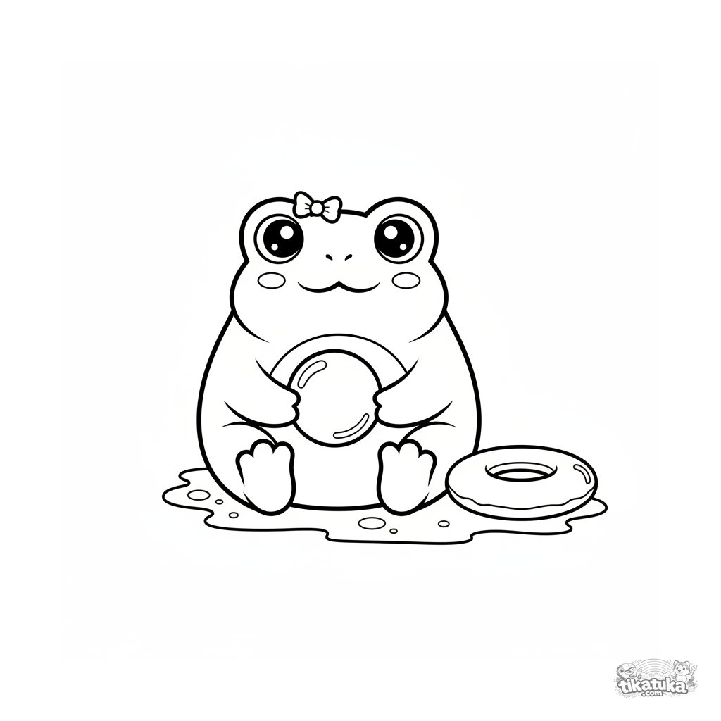 Einfaches Ausmalbild für Kleinkinder 2-3: Ein niedlicher dicker Frosch sitzt am Poolboden neben einem Schwimmring. Große Formen, wenige Details.