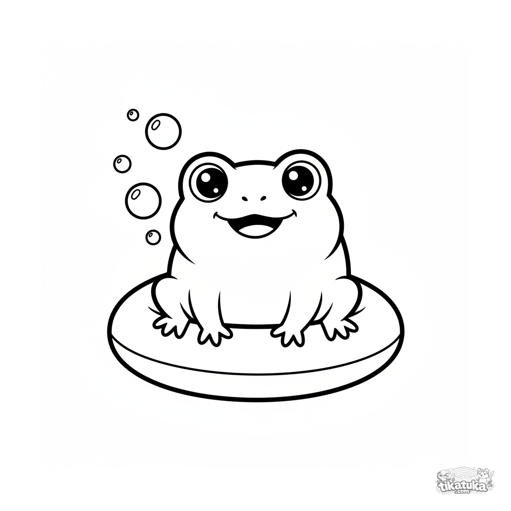Einfaches Ausmalbild für Kleinkinder 2-3 Jahre: süßer Kawaii-Frosch sitzt auf einem aufblasbaren Ring am Poolboden.