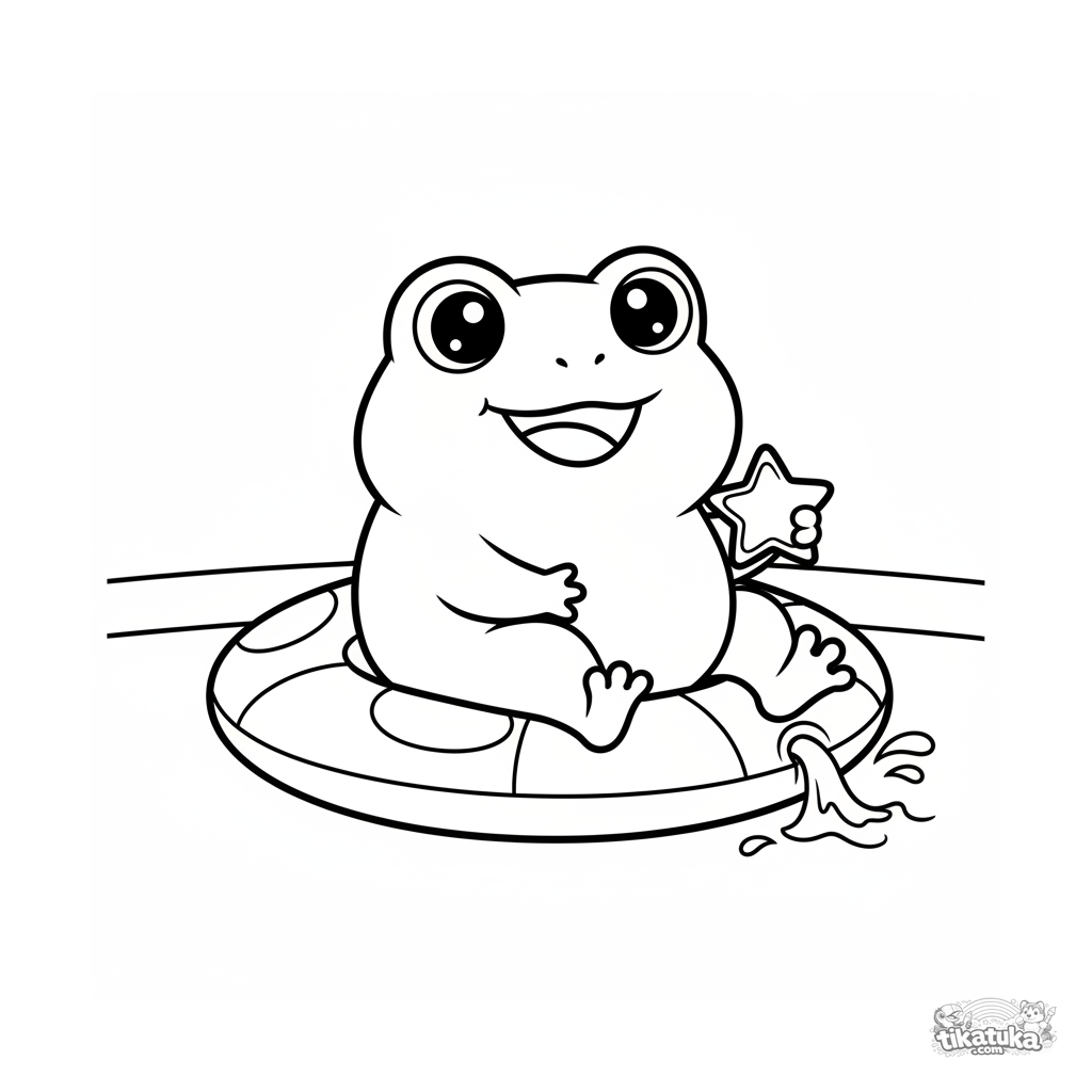 Einfaches Ausmalbild für Kleinkinder 2-3: Ein süßer Kawaii-Frosch sitzt auf einem aufblasbaren Seerosenblatt-Ring am Beckenboden. Große Formen, wenige Details.