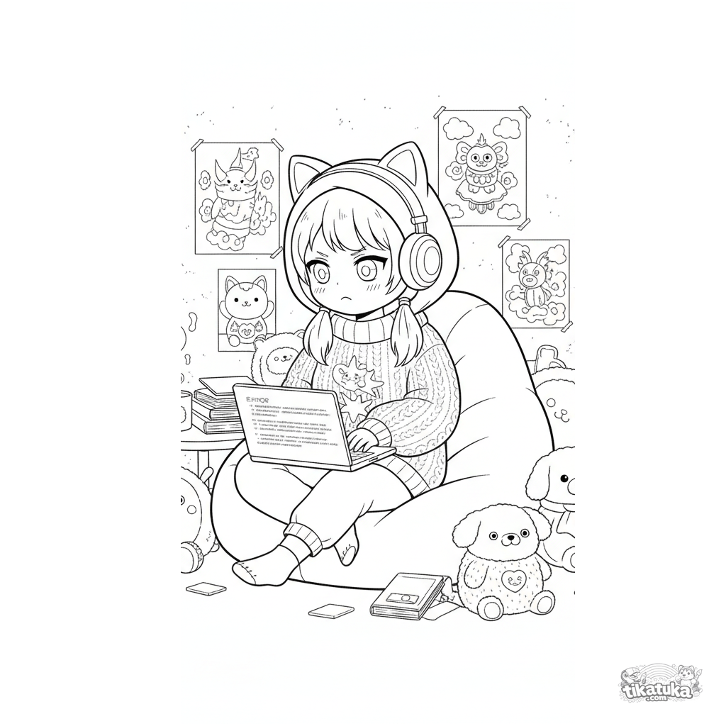 Niedliches Ausmalbild: ein Kawaii-Stil-Hacker mit Katzenohr-Kopfhörern debuggt Code in einem gemütlichen Keller. Viele Details: Plüschtiere, Poster.