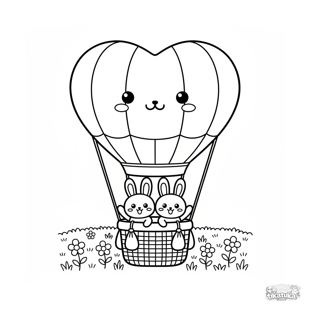 Niedliches Ausmalbild eines herzförmigen Heißluftballons mit Korb, der über einer blumigen Wiese schwebt. Kawaii-Stil für Kinder von 4-6 Jahren.