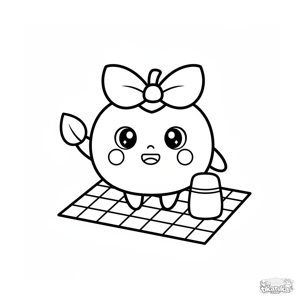 Ausmalbild für Kleinkinder: eine Kawaii-Kaki mit Schleife steht auf einer karierten Picknickdecke. Einfache Formen, breite Ränder für Kinder von 2-3 Jahren.