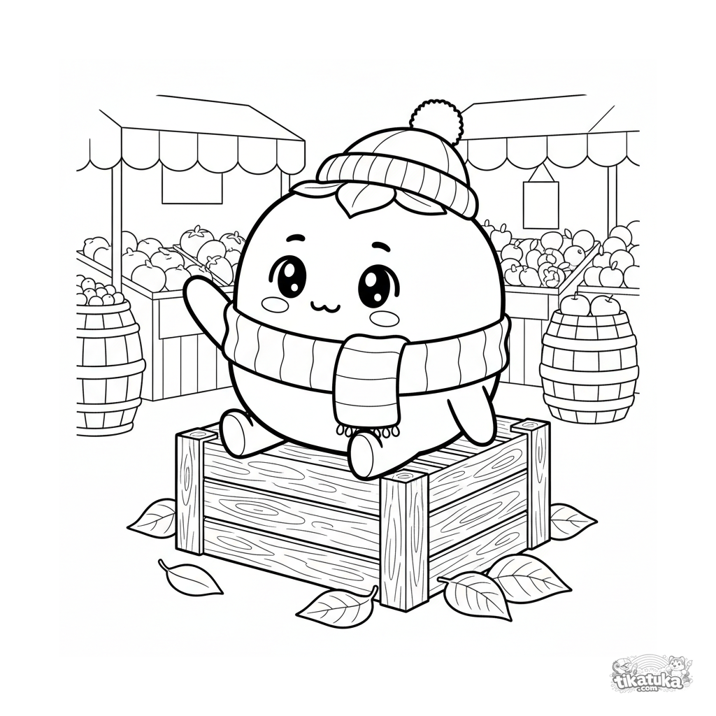 Ausmalbild eines süßen Kakis mit Schal auf einem Herbstmarkt. Für Kinder von 4-6 Jahren. Kawaii-Stil, einfache Formen.