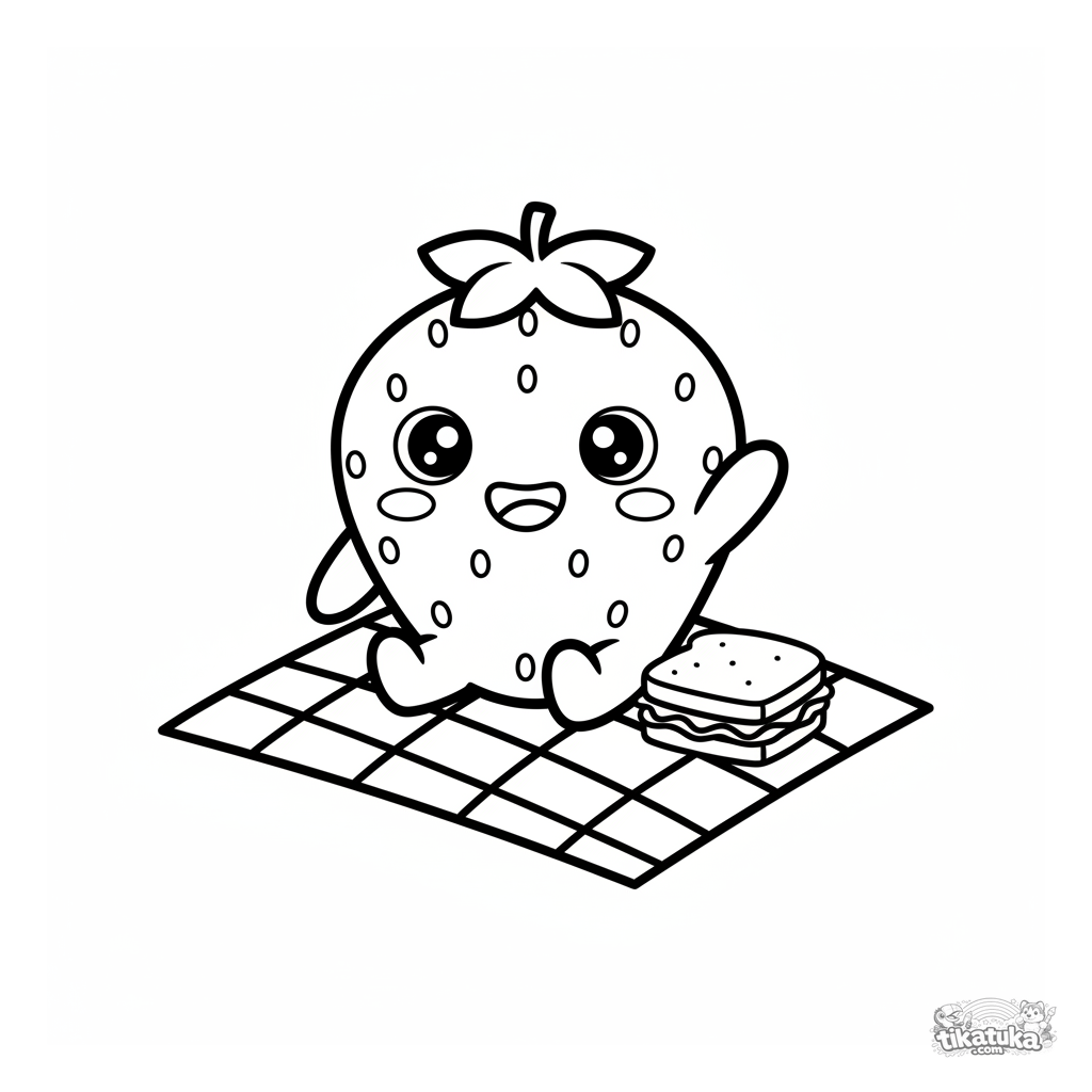 Ausmalbild für Kleinkinder: eine niedliche Kawaii-Erdbeere sitzt auf einer karierten Picknickdecke. Einfache Formen und breite Ränder für das erste Ausmalen.