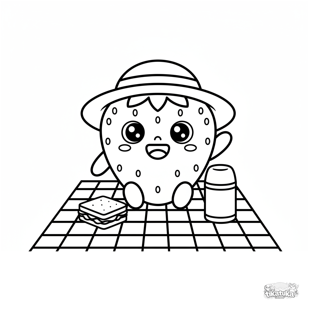 Ausmalbild für Kleinkinder: eine fröhliche Erdbeere mit Hut winkt von einer Picknickdecke. Einfache Formen und breite Ränder.