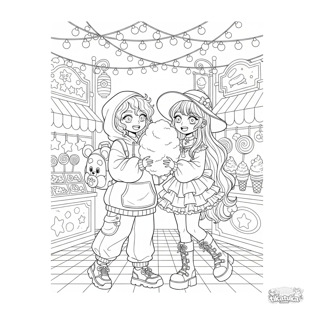 Ausmalbild für Kinder von 7-12 Jahren: ein fröhliches Kawaii-Street-Fashion-Duo teilt sich Zuckerwatte auf einem beleuchteten Nachtmarkt.