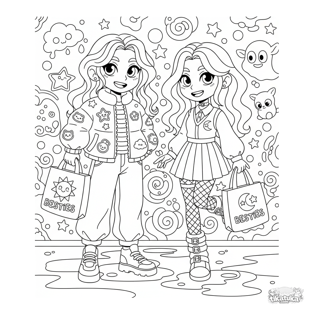 Ausmalbild für Kinder von 7-12 Jahren: Ein Duo in lebendiger Kawaii-Street-Fashion posiert vor einer Graffiti-Wand. Detaillierte Szene mit Taschen, Patches und Kunst.
