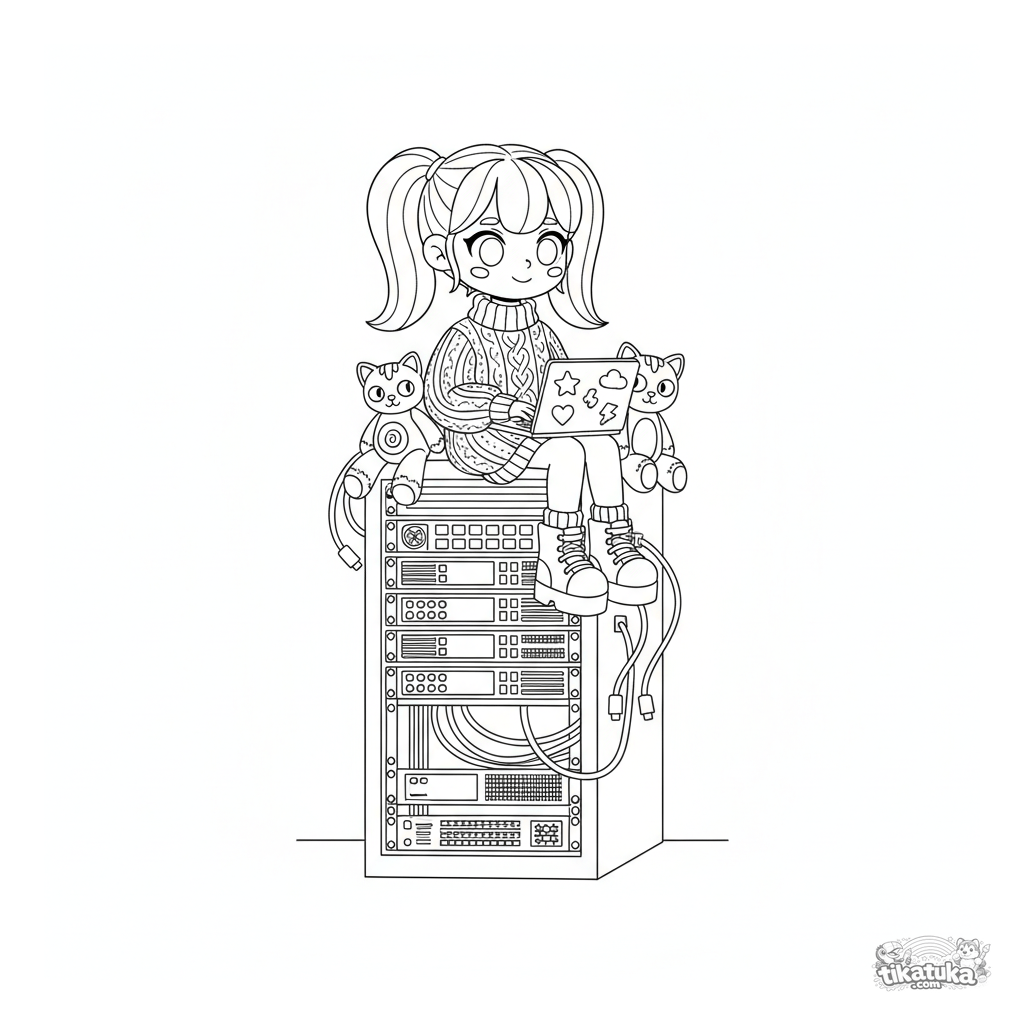 Anime-Stil Ausmalbild: Ein Hacker im Kawaii-Look sitzt auf einem Server-Rack mit einem Laptop. Lebendige Szene mit süßen Details.