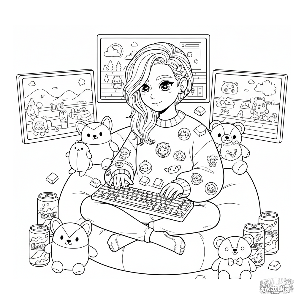 Ausmalbild für Kinder 10-12: Ein Hacker im Kawaii-Stil passt im Keller eine mechanische Tastatur an. Detaillierte Szene mit Plüschtieren und Monitoren.