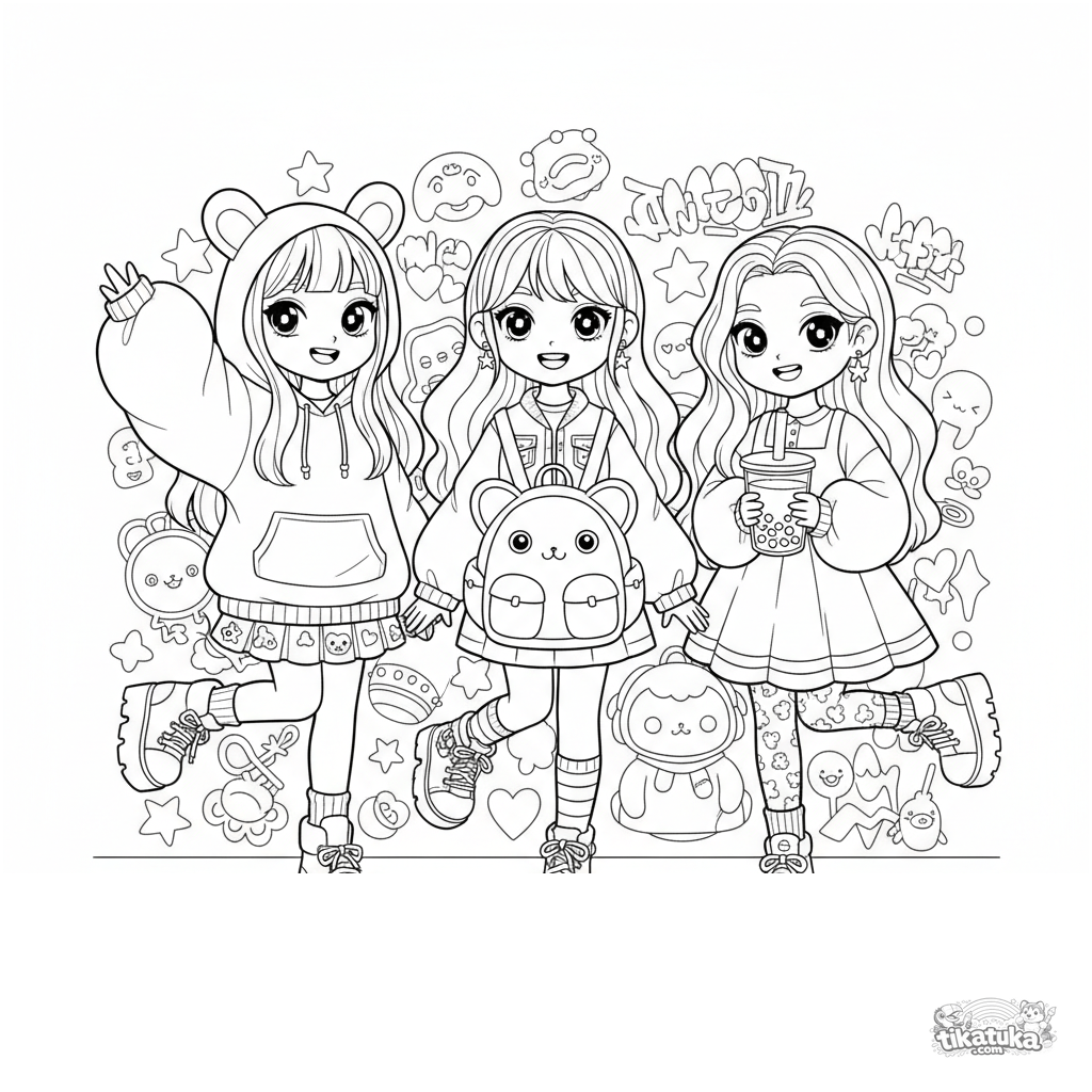 Ausmalbild für Kinder von 7-12 Jahren: Ein Kawaii-Street-Fashion-Trio posiert vor einer lebendigen Graffiti-Wand. Komplexe Szene mit detaillierter Kleidung und Accessoires.