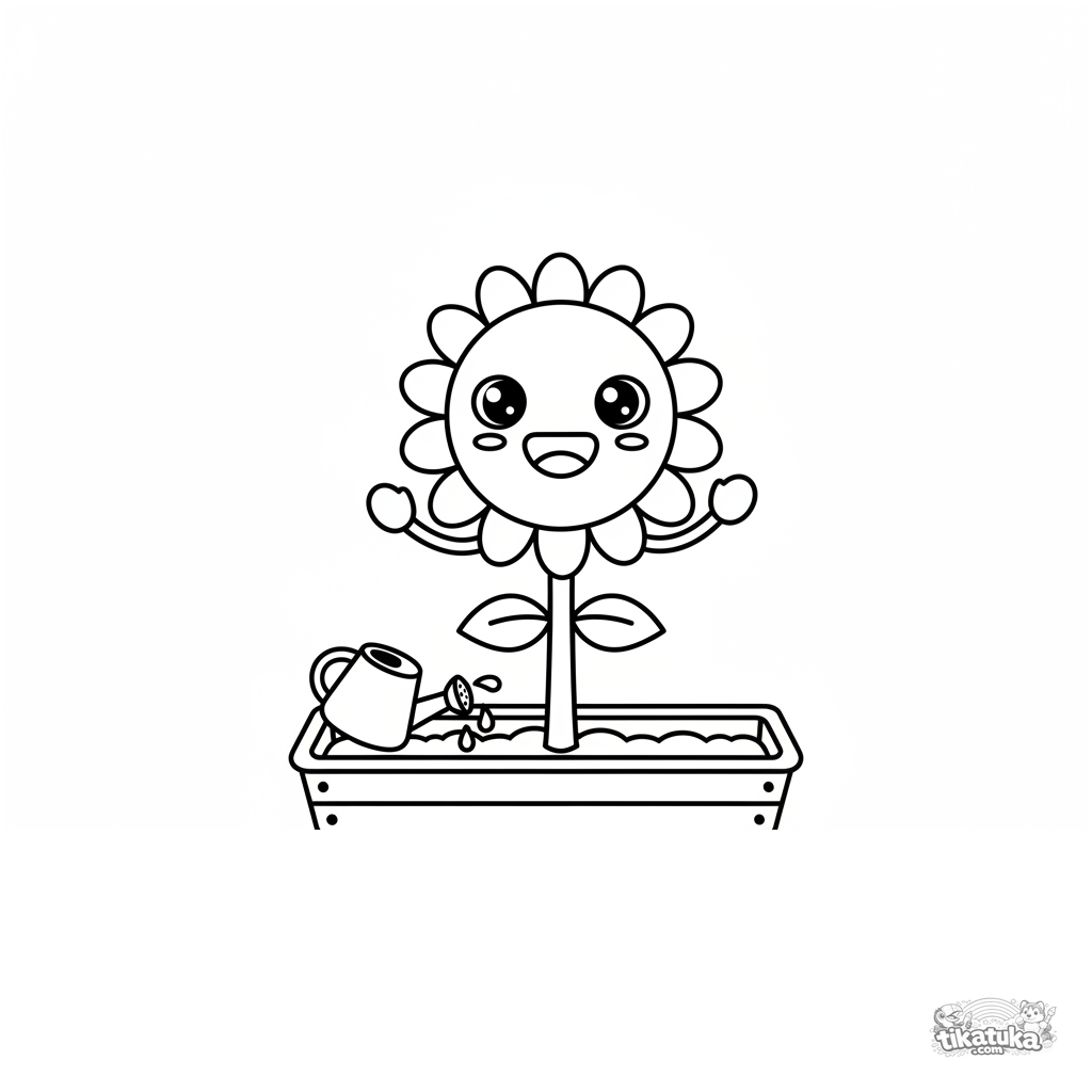 Einfaches Ausmalbild für Kleinkinder 2-3: Eine fröhliche Sonnenblume mit Gesicht winkt mit ihren Blattarmen im Gartenbeet. Große Formen.