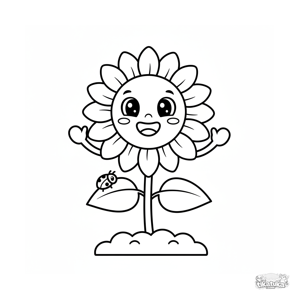 Ausmalbild für Kleinkinder: Eine lächelnde kawaii Sonnenblume winkt mit ihren Blattarmen im Garten. Einfache Formen, breite weiße Ränder.