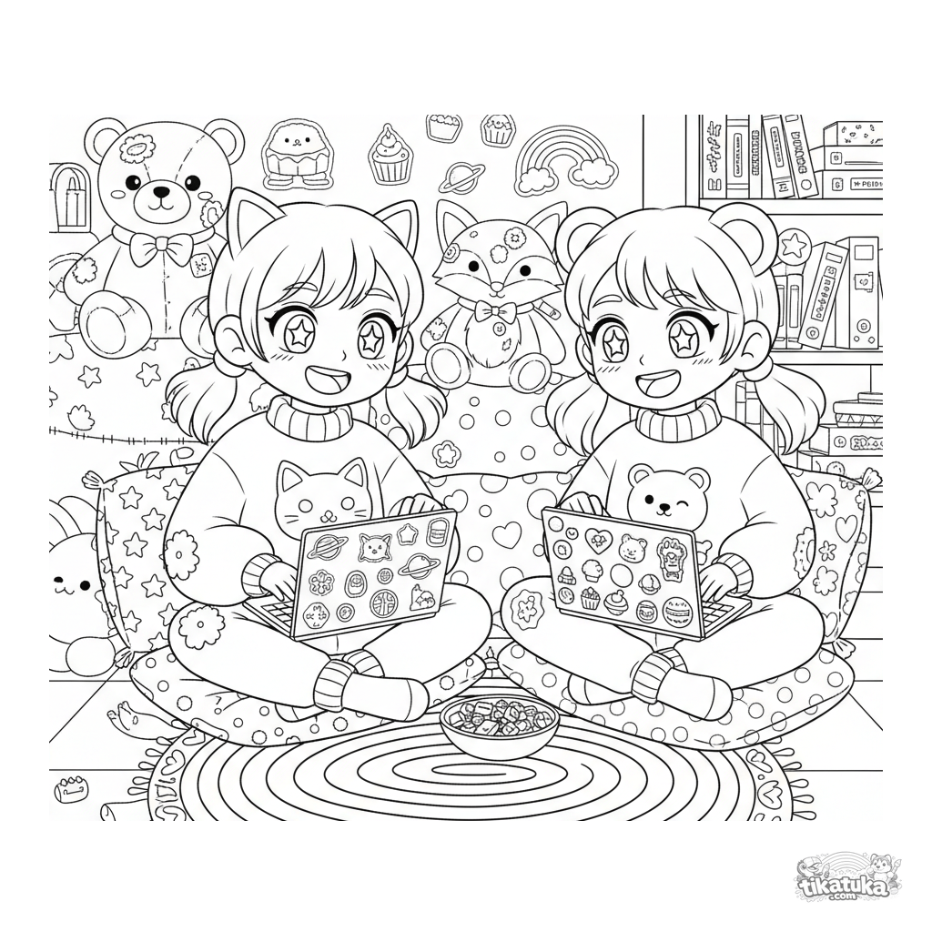Ausmalbild für Kinder von 10-12 Jahren: Zwei Freunde in einer gemütlichen Kellerecke dekorieren ihre Laptops mit Stickern und Keycaps im Kawaii-Stil. Viele niedliche Details und Accessoires.