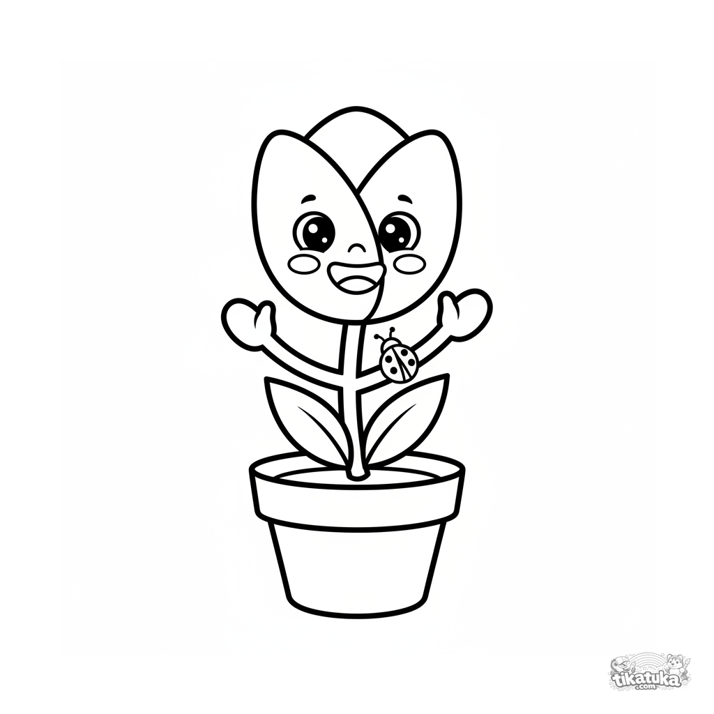 Ausmalbild für Kleinkinder: Eine lächelnde Tulpe im Topf winkt mit ihren Blattarmen. Einfache Formen mit breiten Rändern.