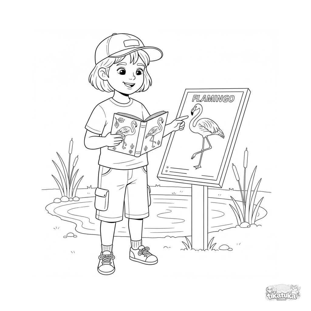 Detailliertes Ausmalbild für 10-12-Jährige: Ein Kind vergleicht einen Flamingo in einem Feldführer mit einer Info-Tafel im Zoo.