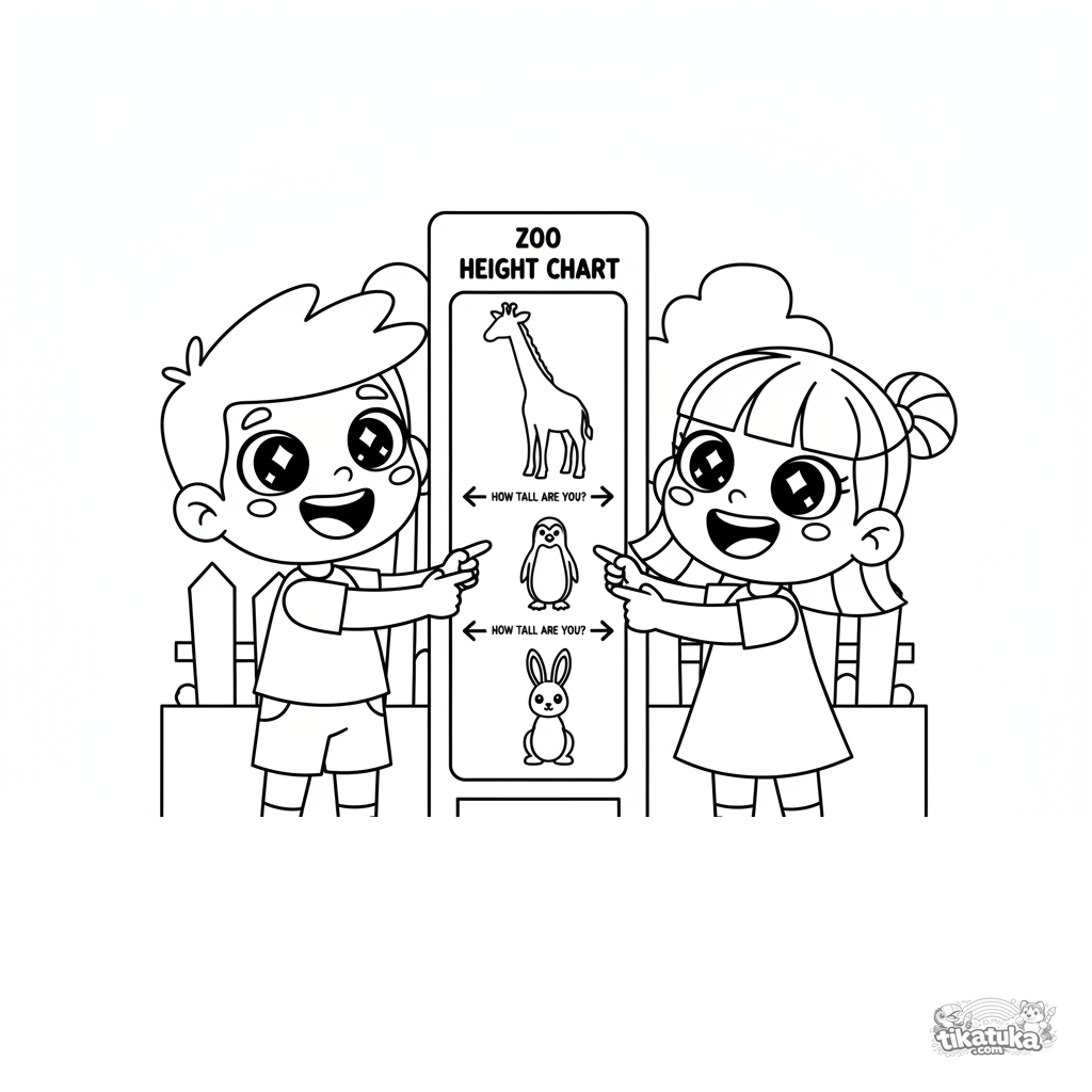 Ausmalbild für Kinder 7-9: Zwei Kinder an einer Zootafel vergleichen ihre Körpergröße mit Tiergrößen an einem speziellen Messdiagramm. Lustige und lehrreiche Szene.