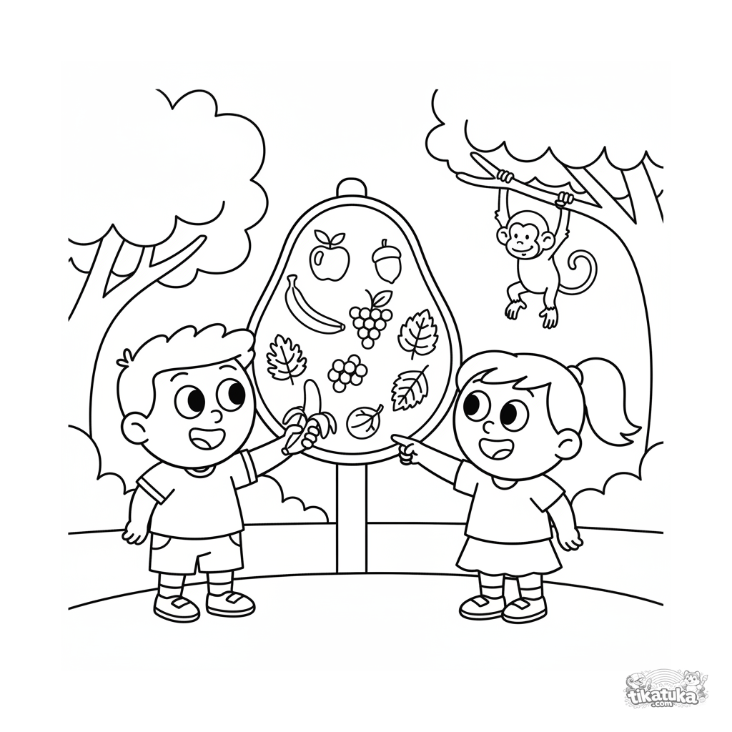 Ausmalbild für 7-9 Jahre: Zwei Kinder vergleichen eine echte Banane mit einem bunten Affen-Ernährungsplan am Zoo-Gehege. Lehrreiche Szene über Tiernahrung.