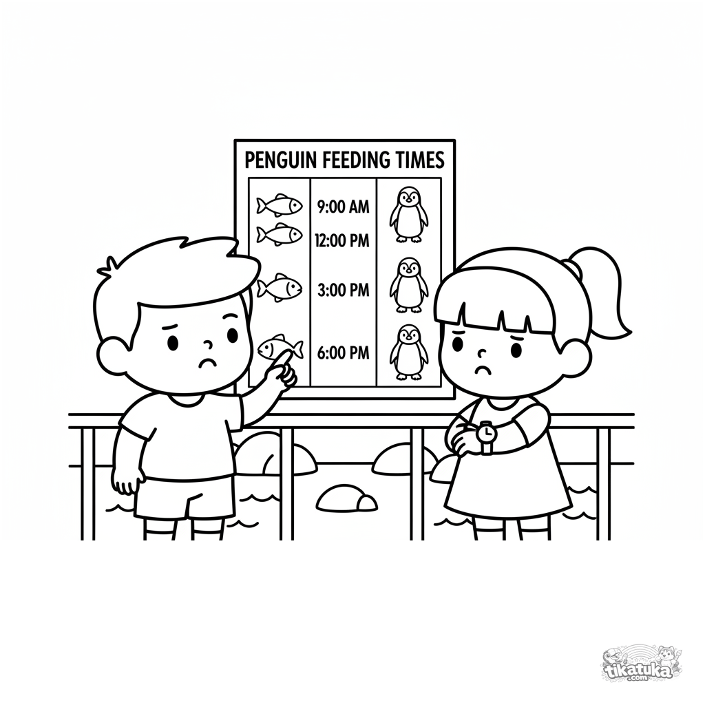 Ausmalbild für Kinder 7-9 Jahre. Zwei Kinder vergleichen einen großen Pinguin-Fütterungsplan mit Fischsymbolen und checken eine Uhr am Zoo-Lebensraum.