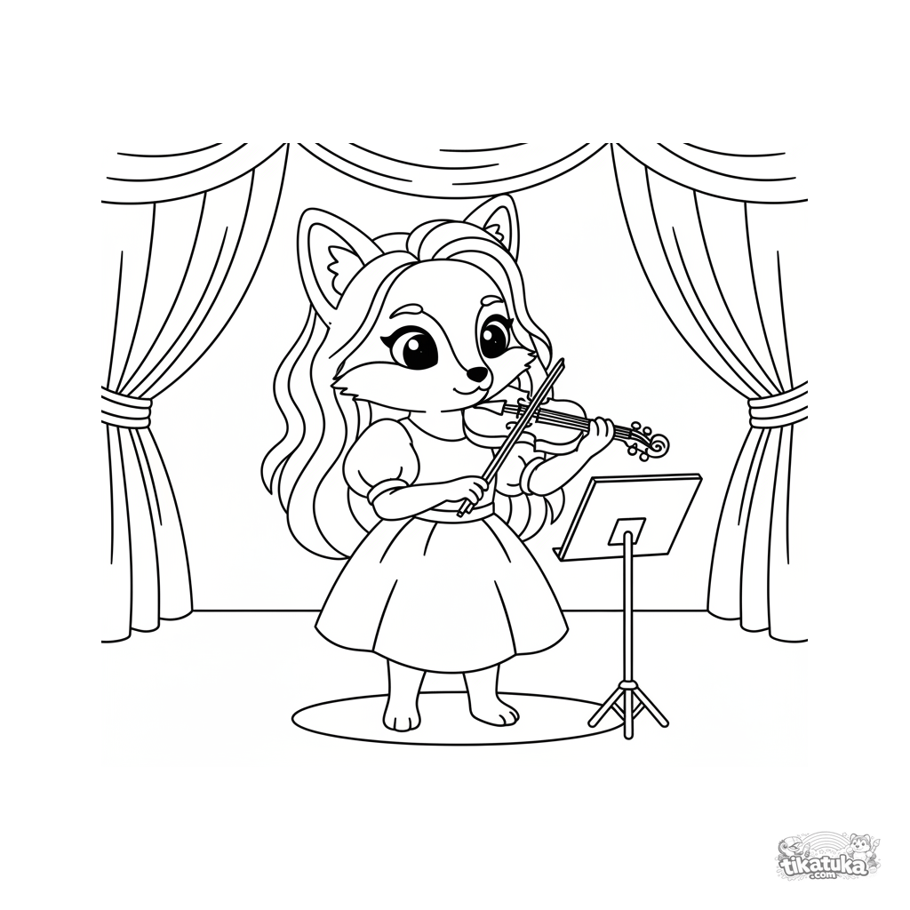 Ausmalbild für Kinder 4-6 Jahre: eine süße Füchsin-Geigerin, die Musik auf einer großen Konzerthallenbühne spielt. Klare Umrisse, verständliche Komposition mit Notenständer.