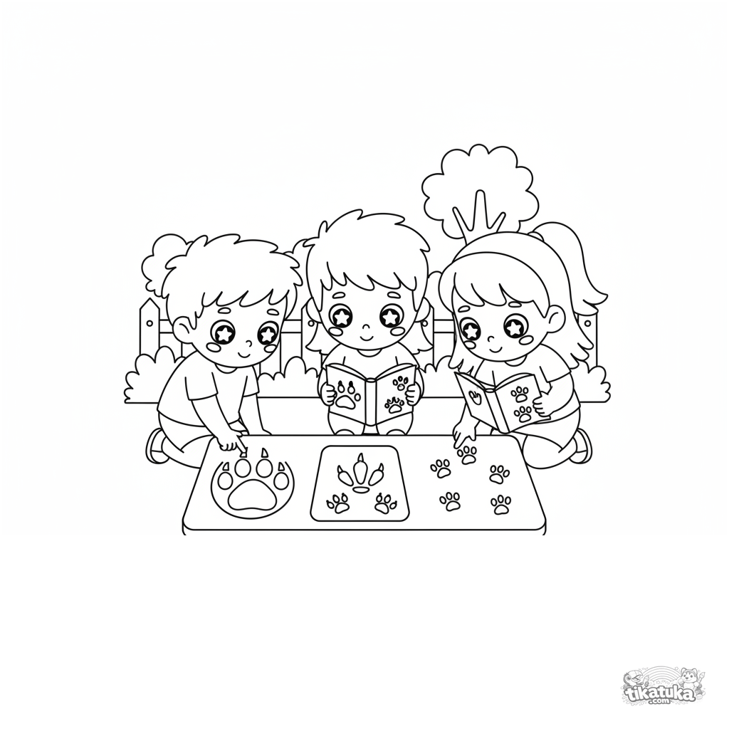 Ausmalbild für Kinder 4-6: Kinder studieren und vergleichen verschiedene Tierspuren auf einem besonderen Schild im Zoo. Heller flacher Vektorstil.