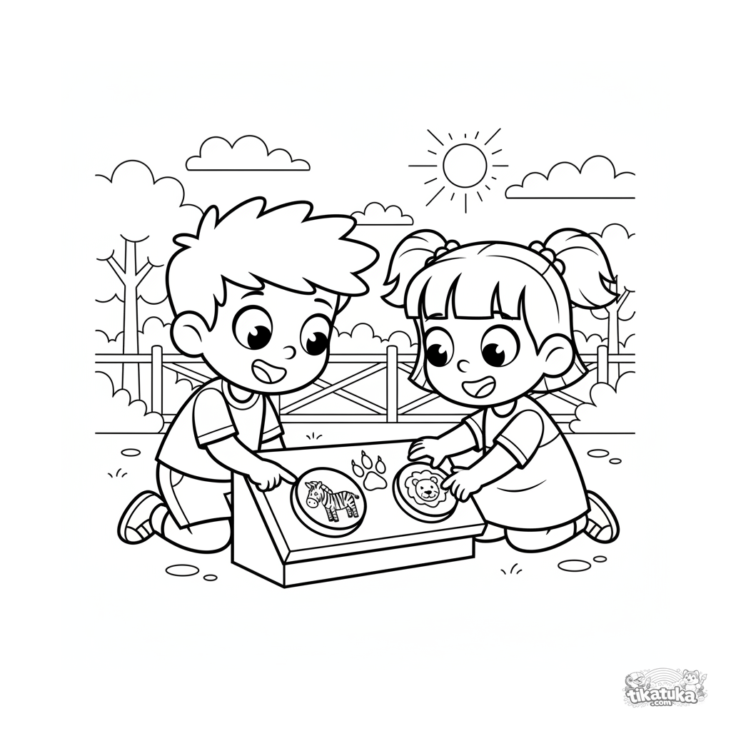 Ausmalbild für Kinder 7-9: Zwei Kinder an einem interaktiven Zoo-Schild ordnen Tierfußabdrücke Bildern zu. Eine Lern-durch-Spiel-Szene.