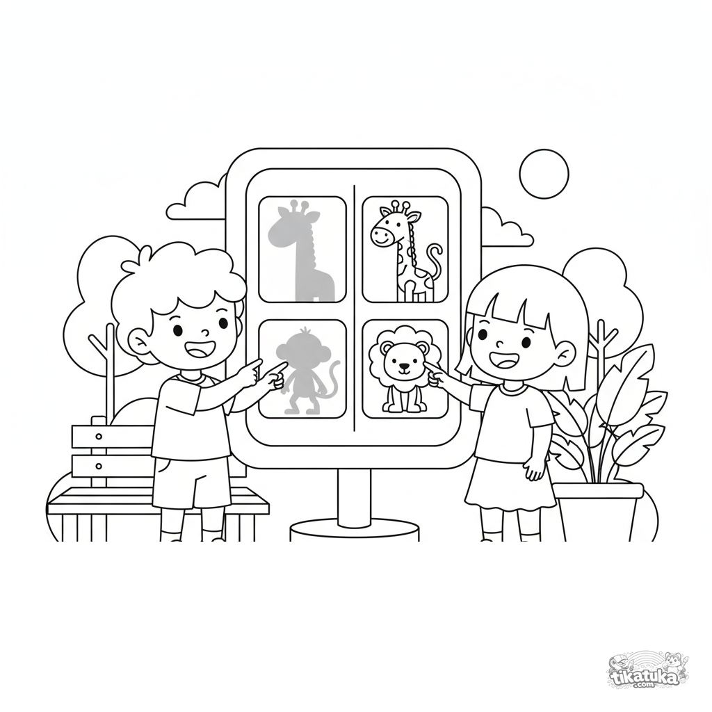 Ausmalbild für Kinder 7-9: Zwei Kinder spielen ein 'Schatten zuordnen'-Spiel an einem interaktiven Zoo-Schild. Lehrreiche Szene.