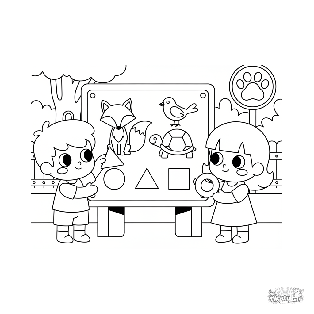 Ausmalbild für Kinder 7-9: Ein Junge und ein Mädchen an einer interaktiven Zoo-Tafel ordnen geometrische Formen Tiersilhouetten zu. Fördert Logik und Formerkenntnis.