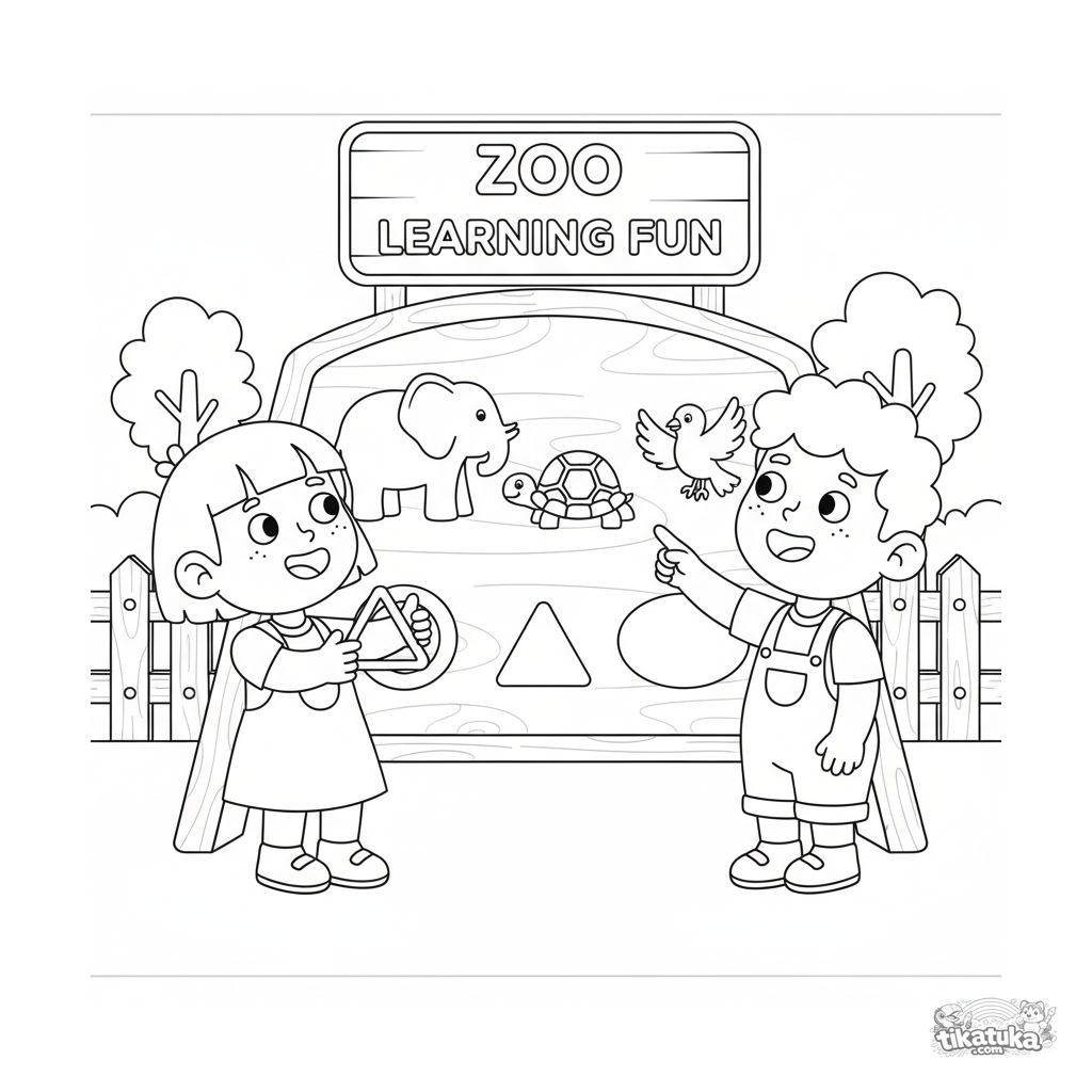 Ausmalbild für Kinder 4-6: Kinder an einem interaktiven Zoo-Brett, ordnen Formen Tiersilhouetten zu. Lehrreiches Spiel über Formen.