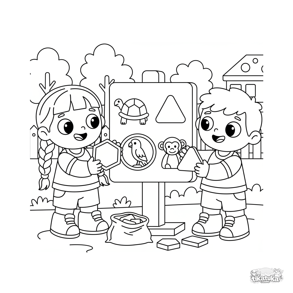 Ausmalbild für Kinder von 7-9 Jahren. Kinder spielen mit einem interaktiven Zoo-Schild und passen geometrische Formen an Tier-Silhouetten an. Szene zum Lernen über Formen.