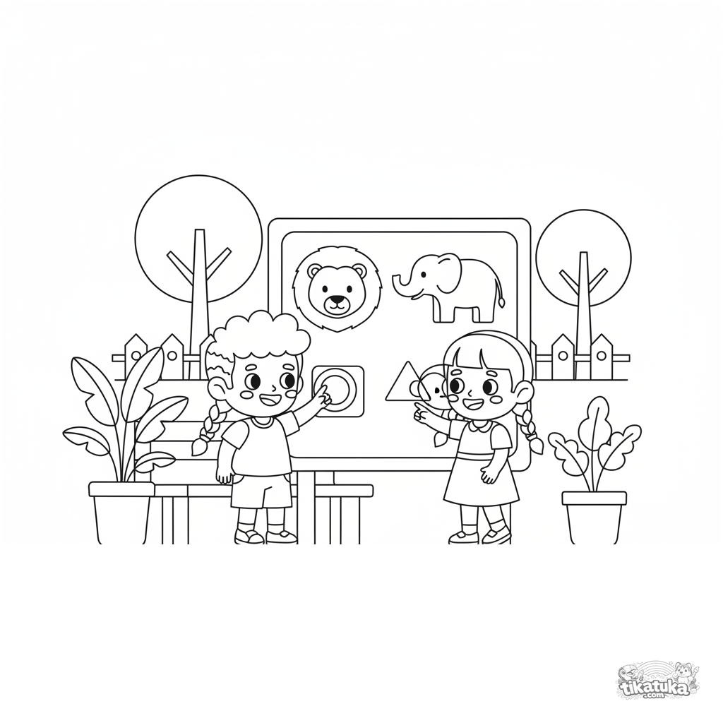 Ausmalbild für Kinder 7-9: Zwei Kinder spielen mit einem interaktiven Schild und passen geometrische Formen zu Tier-Silhouetten im Zoo. Dynamische Szene über Formen und Logik.